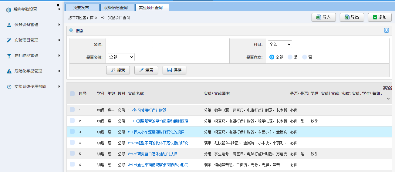 实验室管理系统是专门为中小学实验室器材,危化品,易耗品台账管理,实验室预约,实验通知,检查记录,报损记录等功能。欢迎使用。