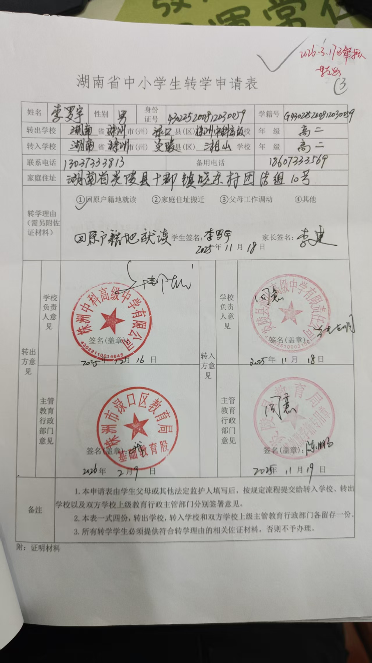 1. 校内申请时间: 2026/4/3 19:48:24      异动类型: 转出     异动去向: 炎陵县湘山高级中学有限责任公司    网办时间:2026-03-17T19:48    办理人:jkxx    家长电话:13037333813    学生电话:18607333569    备注:回户籍地